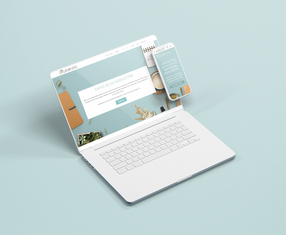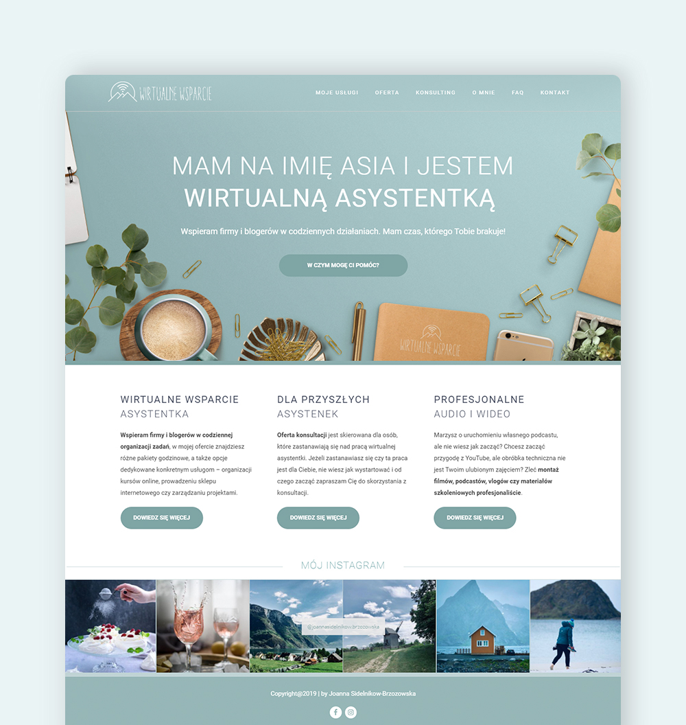 Projekt oraz wdrożenie strony internetowej Wirtualne Wsparcie. Kolorystyka i stylistyka zostały dopasowane do marki osobistej. Do wdrożenia został wybrany system WordPress – m.in. ze względu na dalszą, samodzielną obsługę strony przez właścicielkę marki.